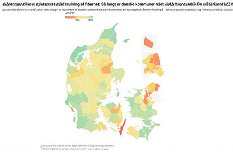 Mens nogle kommuner har 100% dækning, halter andre bagud med mindre end 50 %. Det viser en opgørelse fra Digitaliseringsstyrelsens portal Tjekditnet.dk, som sammenligningsportalen Bredbånd.dk har analyseret. I gennemsnit har 89,8 % af danske boliger, sommerhuse og virksomheder adgang til fibernet.
